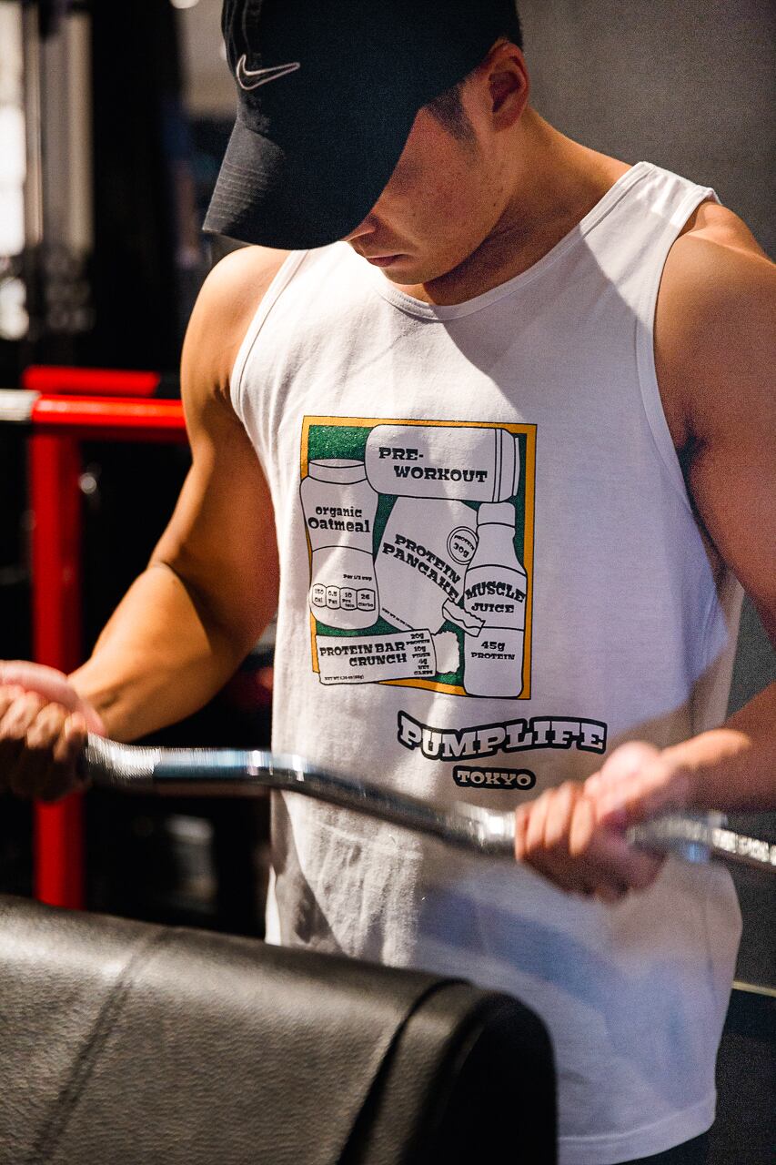 トレーニーなら誰でも大好きなマッスルミールのプリントを落とし込んだダンクトップ