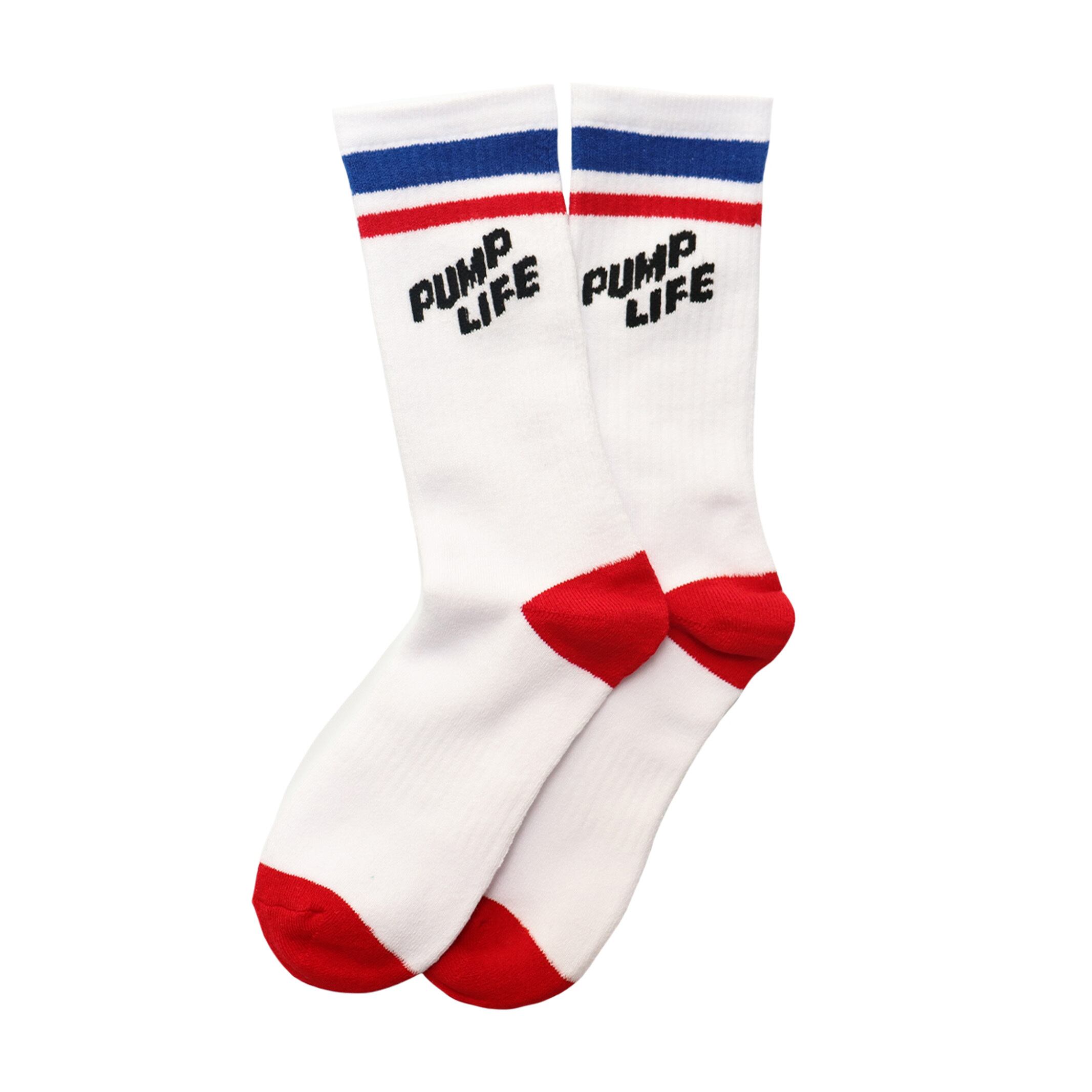 ブルーとレッドラインを使った靴下をアクセントにしていつもとは違ったコーディネートの演出をします。